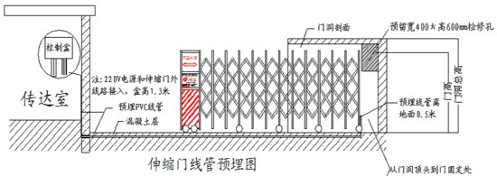4)智能红外线探头防碰撞装置:门体在关闭过程中遇人或异物30-50cm可自动返回运行,从而保障车辆及行人的安全。 标准结构:门排内空(即前后相临两大弯主管之间的距离,不含主管尺寸)采用不锈钢伸缩门标准尺寸320mm(参照国外技术),保证交叉管最固,并大大减少运行噪音。
