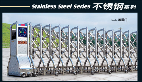 3)不锈钢伸缩门活动部位特点:伸缩门的每个活动部位环节均采用不锈钢管轴、轴瓦、不锈钢螺母,尼龙衬垫组装, 组装时每剪板机个环节点加注高级润滑油,无噪音,伸缩自如。