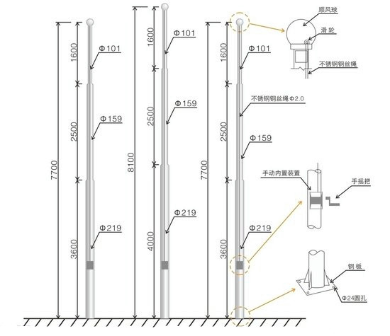 无需套环:旗杆球冠设有导孔配合和张紧结构能使挂旗杆与杆无接触,始终处于平衡,杆与杆之间无摩擦噪音,球冠顺风转动更灵活,使得旗杆整体挺拔壮观。