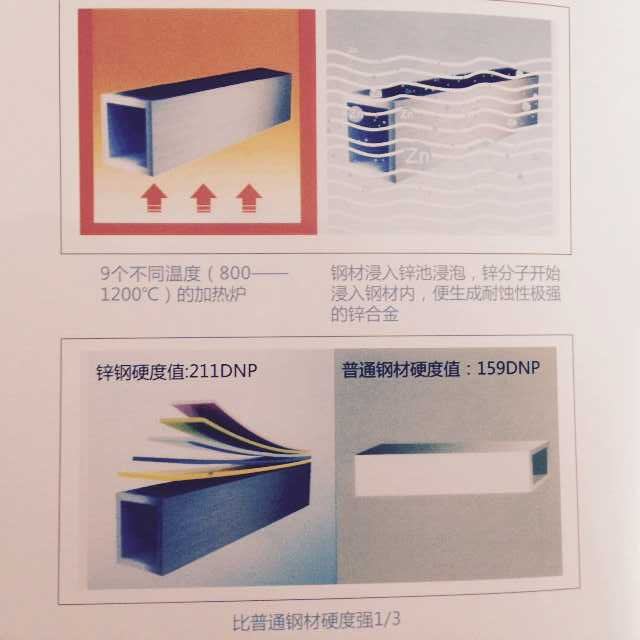 这是一个科技飞速发展的时代,深圳圣田推出彩色锌钢型材。它的面世将会取代不锈钢和传统铁艺。圣田工业型材采用世界上最先进的热镀锌处理工艺。热镀锌处理工艺是目前世界上最先进的金属防腐处理工艺。简而言之,就是将温度接近1200度的冷轧钢管放置熔化的锌池,经过6-10分钟浸泡,使其在高温下产生化学反应,形成自然界中极难被腐蚀的锌钢合金。其耐腐蚀性是电镀锌的3-5倍。圣田工业型材即使表面不经过涂装处理,在自然环境下也可以保证20年不腐蚀。
